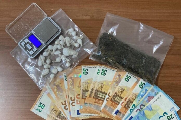 In particolare sono state trovati e sequestrati 27,5 grammi di cocaina, suddivisa in 26 dosi, 82 grammi di marijuana, un bilancino, materiale per il confezionamento e la somma di denaro ritenuta provento dell’attività di spaccio. Tutto il materiale è stato sequestrato.