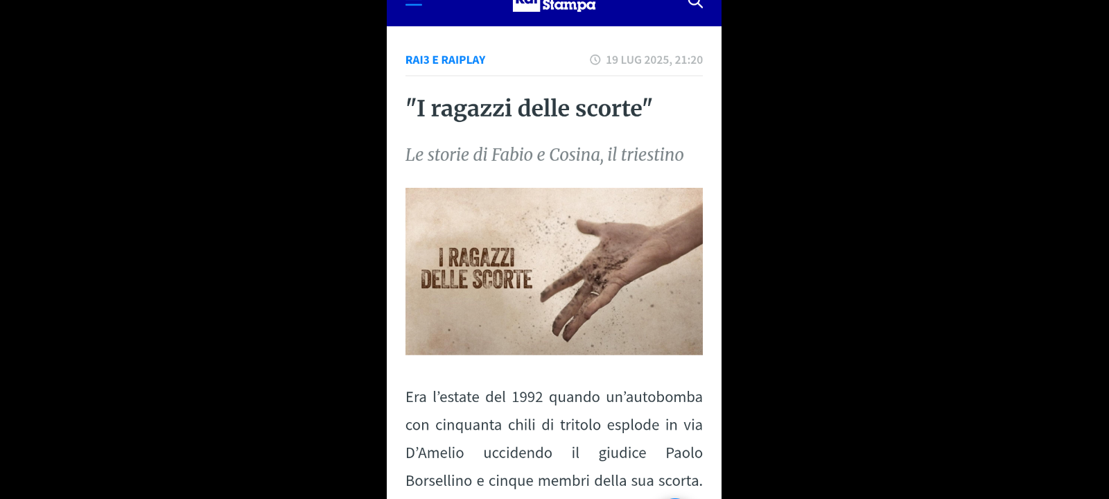 Era l’estate del 1992 quando un’autobomba con cinquanta chili di tritolo esplode in via D’Amelio uccidendo il giudice Paolo Borsellino e cinque membri della sua scorta: in occasione dell’anniversario della strage, il 19 luglio su RaiPlay e su Rai3 in prima serata, arrivano “I ragazzi delle scorte” una produzione del Ministero dell’Interno dipartimento della pubblica sicurezza con 42° Parallelo, a cura della Direzione Rai Contenuti Digitali e Transmediali.