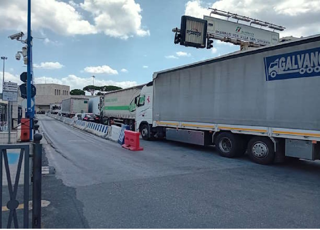Lunghe code al porto storico dove il cantiere per il posteggio di campo delle vettovaglie, già criticato dalla Uiltrasporti, ha ridotto ulteriormente le corsie di stoccaggio dei mezzi verso le invasature Bluferries provocando code che invadono le strade limitrofe.