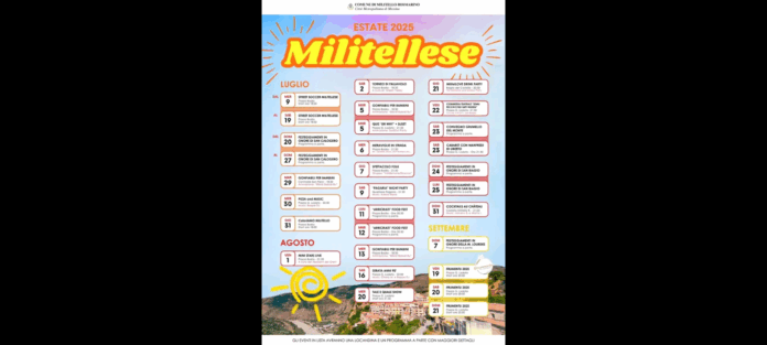 “Estate Militellese 2025: Anche quest’anno il nostro Comune si riempie di musica, sapori, arte e divertimento”! Lo si evidenzia, nella omonima Pagina Facebook, di ‘Calogero Lo Re’, sindaco di Militello Rosmarino in Provincia di Messina.