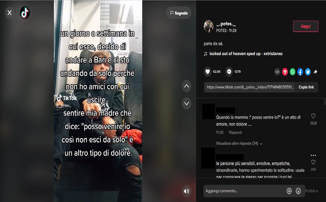 Nel video postato su TikTok Potes descrive la sua solitudine, che a 18 anni dovrebbe perlomeno essere insolita. “Un giorno a settimana in cui esco – scrive il cantante – decido si andare a Bari e ci sto andando da solo perché non ho amici con cui uscire. Sentire mi madre che dice ‘Posso venire io così non esci da solo’, è un altro tipo di dolore”, aggiunge Potes. A seguito della visione del video non si sono fatte attendere le reazioni degli utenti. Sul profilo dell’artista sono piovuti più di 800 commenti dei fan e non solo.