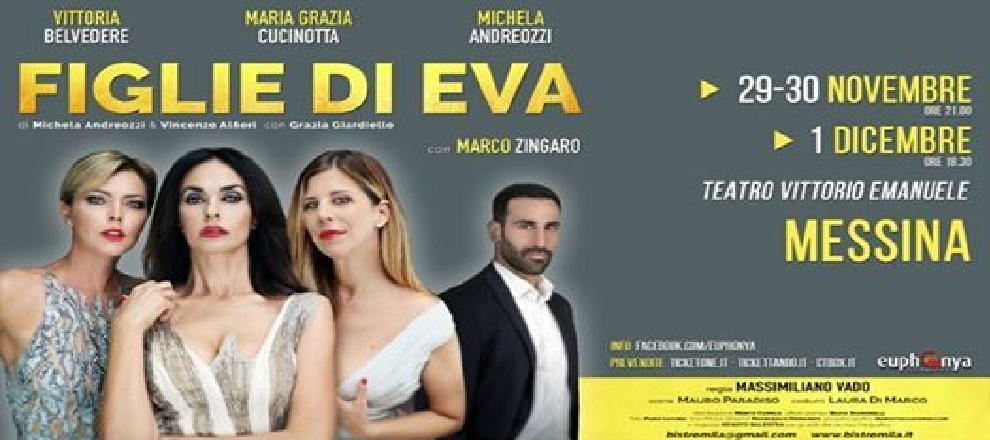 Sbarca in Sicilia la commedia teatrale con Maria Grazia Cucinotta, Vittoria Belvedere e Michela Andreozzi “Figlie di Eva”, tre donne sull’orlo di una crisi di nervi legate allo stesso uomo, un politico spregiudicato e corrotto, candidato premier delle imminenti elezioni. In scena il 29 e 30 novembre e l’1 dicembre 2019 al Teatro Vittorio Emanuele di Messina.