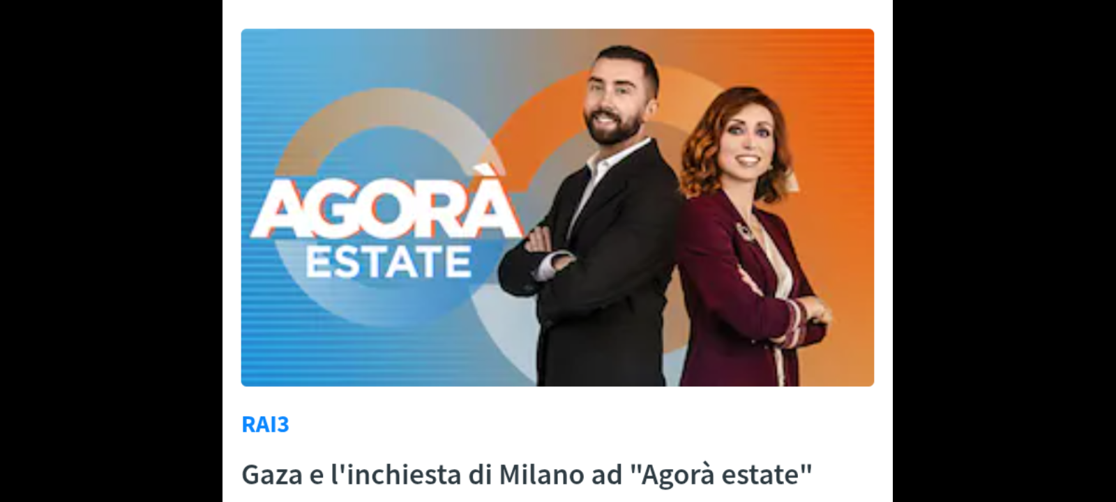 ‘Gaza: raid israeliano sulla chiesa cattolica della Sacra Famiglia, tre morti e diversi feriti tra cui padre Gabriel Romanelli; inchiesta urbanistica a Milano: 74 gli indagati, tra loro anche il sindaco Giuseppe Sala; e poi un’intervista al presidente di Italia Viva Matteo Renzi; a seguire, uno spazio dedicato al 33° anniversario della strage di via D’Amelio in cui persero la vita il giudice Paolo Borsellino e cinque agenti della sua scorta’. Questi alcuni dei temi della puntata di “Agorà estate”, in onda venerdì 18 luglio alle 08.00 su Rai3, con la conduzione di Giulia Di Stefano e Marco Carrara.
