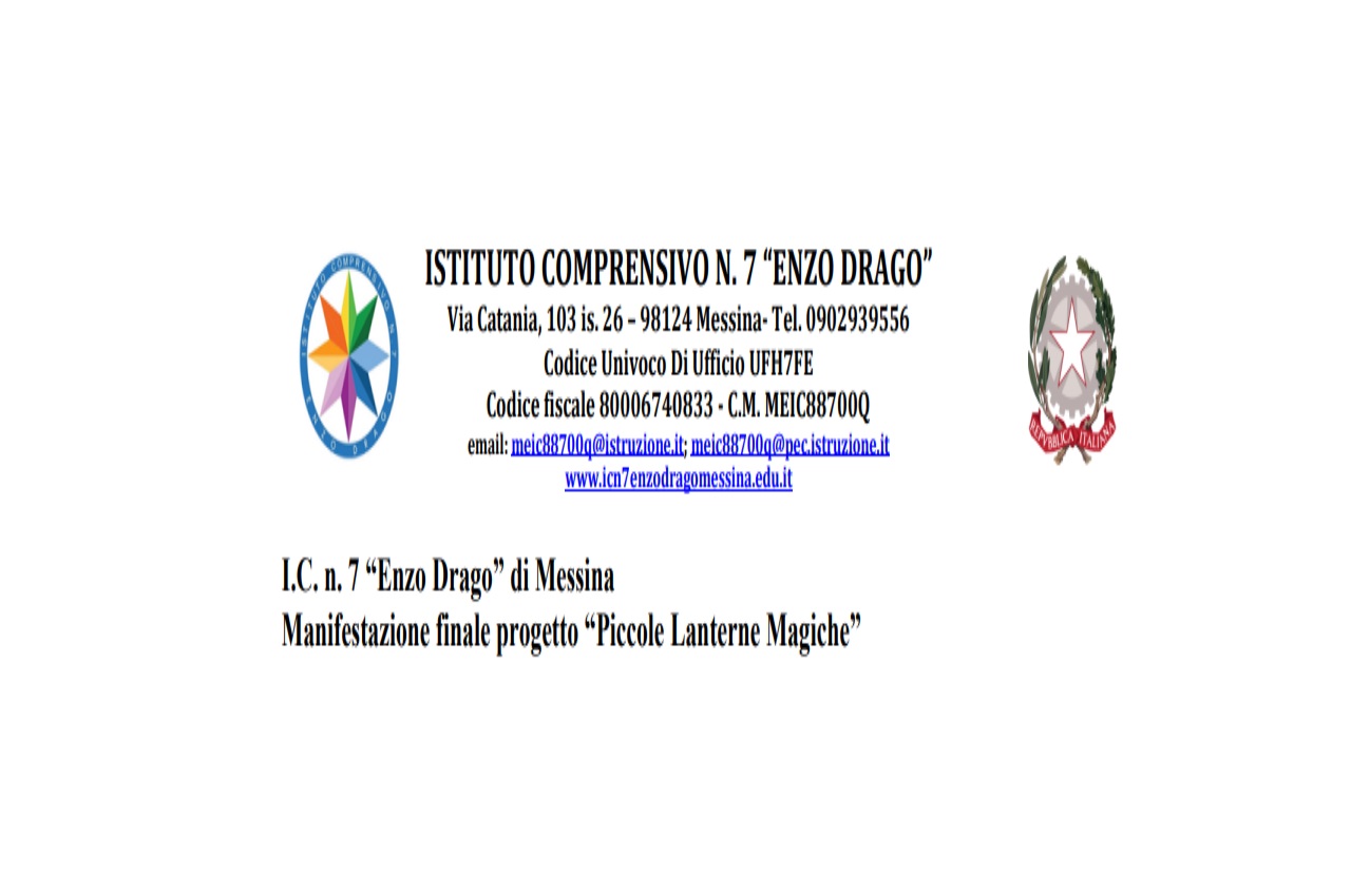 Giovedì 23 novembre 2023 alle ore 10:00 si svolgerà la manifestazione finale del progetto “Piccole Lanterne Magiche” presso l’Auditorium Fasola in via San Filippo Bianchi n. 30, Messina. L’Istituto Comprensivo n. 7 “Enzo Drago” di Messina, con il progetto “Piccole Lanterne Magiche”, ha vinto il bando nazionale “CIPS-Cinema per la Scuola” finanziato dal Ministero dell’Istruzione e del Merito e dal Ministero della Cultura.