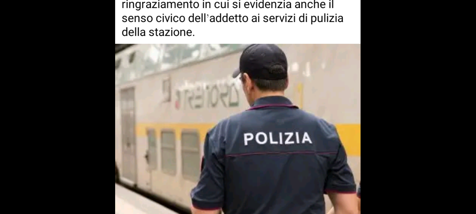 Successivamente ha ringraziato la Polizia di Stato facendo pervenire un biglietto di ringraziamento in cui si evidenzia anche il senso civico dell’addetto ai servizi di pulizia della stazione.