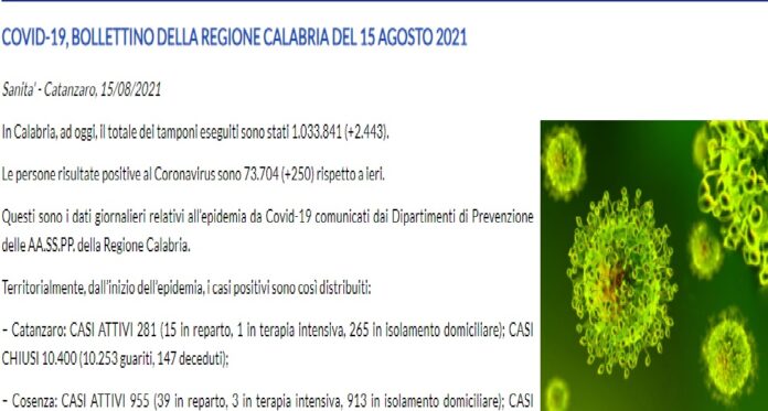 In Calabria, ad oggi, il totale dei tamponi eseguiti sono stati 1.033.841 (+2.443). Le persone risultate positive al Coronavirus sono 73.704 (+250) rispetto a ieri.