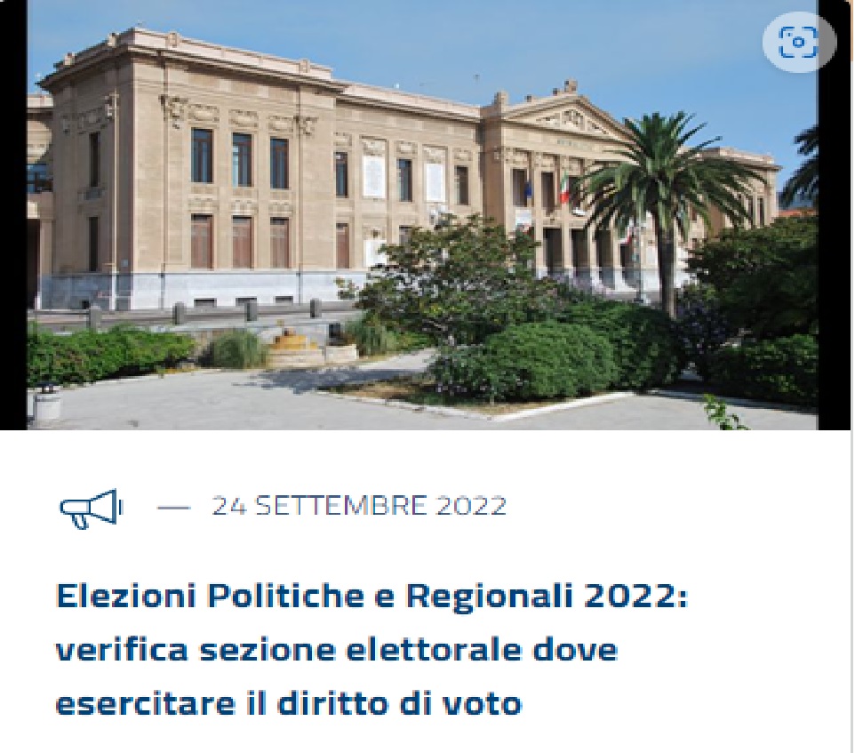 Gli iscritti nelle liste elettorali del Comune di Messina possono verificare la sezione presso la quale esercitare il diritto di voto in occasione delle elezioni del 25 settembre 2022, consultando sul sito istituzionale del Comune di Messina la piattaforma web “Dove voto? Trova la tua sezione elettorale”.
