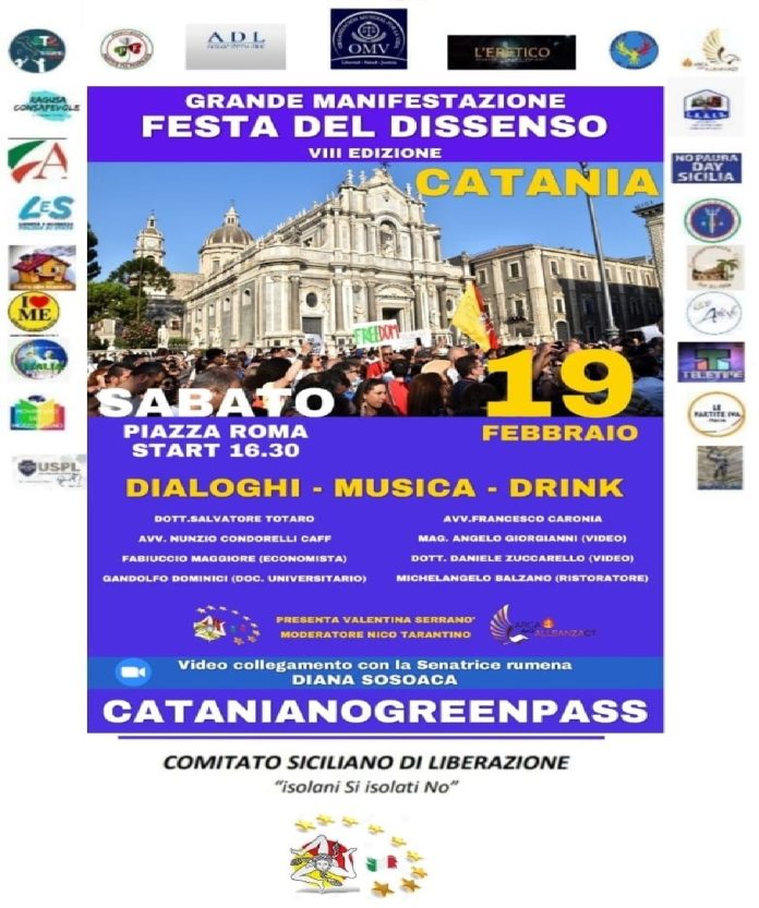 Grande Manifestazione: “7^ edizione della Festa del Dissenso”. L’iniziativa…, organizzata dai componenti del ‘Comitato Siciliano di Liberazione’ si terrà oggi sabato 19 febbraio 2022 in piazza Roma a Catania alle ore 16.30.