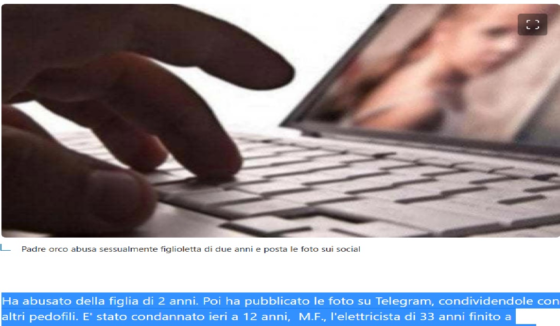 Ha abusato della figlia di 2 anni…, poi ha pubblicato le foto su Telegram, condividendole con altri pedofili: è stato condannato martedì a 12 anni, M.F., l’elettricista di 33 anni finito a processo per aver diffuso una serie di foto scattate durante una violenza sessuale sulla figlia. L’uomo, che nella chat Telegram di pedofili, si faceva chiamare “sono il papà”, come racconta il Corriere della Sera, era accusato di violenza sessuale su minore e detenzione, produzione e cessione di materiale pedopornografico.