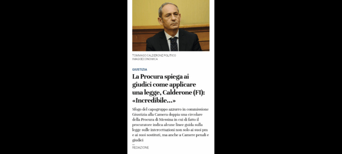 «Ho avuto modo di leggere una circolare di una Procura della Repubblica nella quale vengono dettate le linee guida di interpretazione sulla recente legge sulla durata delle intercettazioni, non credevo ai miei occhi». Comincia così la dichiarazione di Tommaso Calderone, capogruppo di Forza Italia in commissione Giustizia alla Camera, in riferimento a una circolare della Procura di Messina in cui di fatto il procuratore indica alcune linee guida sulla legge sulle intercettazioni non solo ai suoi pm e ai suoi sostituti, ma anche a Ordine degli avvocati e Camera penale e, soprattutto, ai colleghi giudici (cioè al presidente del Tribunale), come se la Procura e il suo vertice potessero dare indicazioni ai giudici.