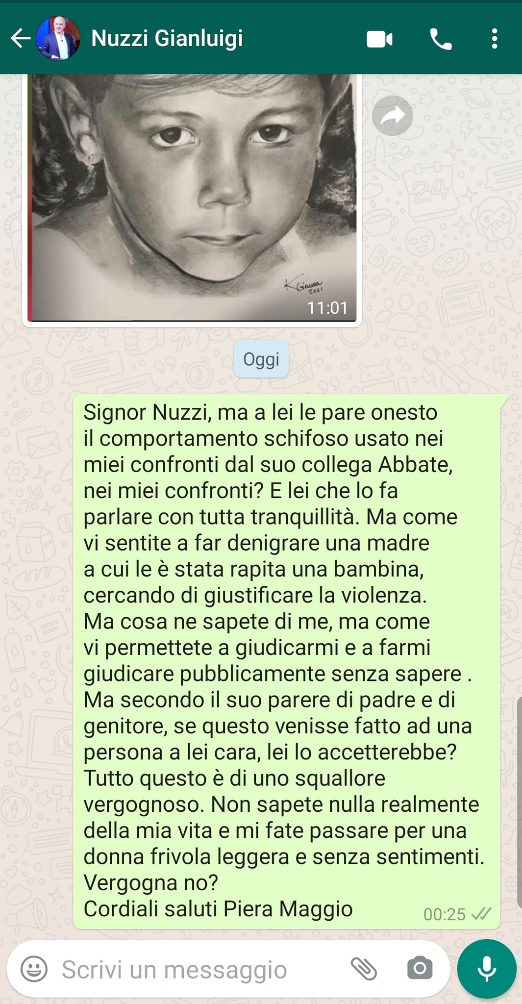 La Maggio ha aggiunto: “e lei che lo fa parlare con tutta tranquillità. Ma come vi sentite a far denigrare una madre a cui le è stata rapita una bambina, cercando di giustificare la violenza. Ma cosa ne sapete di me, ma come vi permettete a giudicarmi e a farmi giudicare pubblicamente senza sapere. Ma secondo il suo parere di padre e di genitore, se questo venisse fatto ad una persona a lei cara, lei lo accetterebbe? Tutto questo è di uno squallore vergognoso. Non sapete nulla realmente della mia vita e mi fate passare per una donna frivola leggera e senza sentimenti. Vergogna no?”.