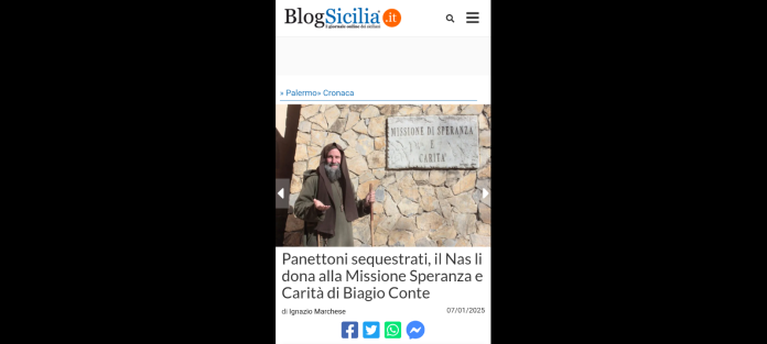 I carabinieri del Nucleo antisofisticazioni e sanità di Palermo hanno consegnato alla “Missione di Speranza e Carità”, fondata da fratel Biagio Conte, 30 panettoni sequestrati durante lo scorso mese di dicembre nel capoluogo. I dolciumi…, erano stati posti sotto sequestro… perché la loro confezione non rispettava il rigoroso disciplinare nazionale in materia di prodotti artigianali.