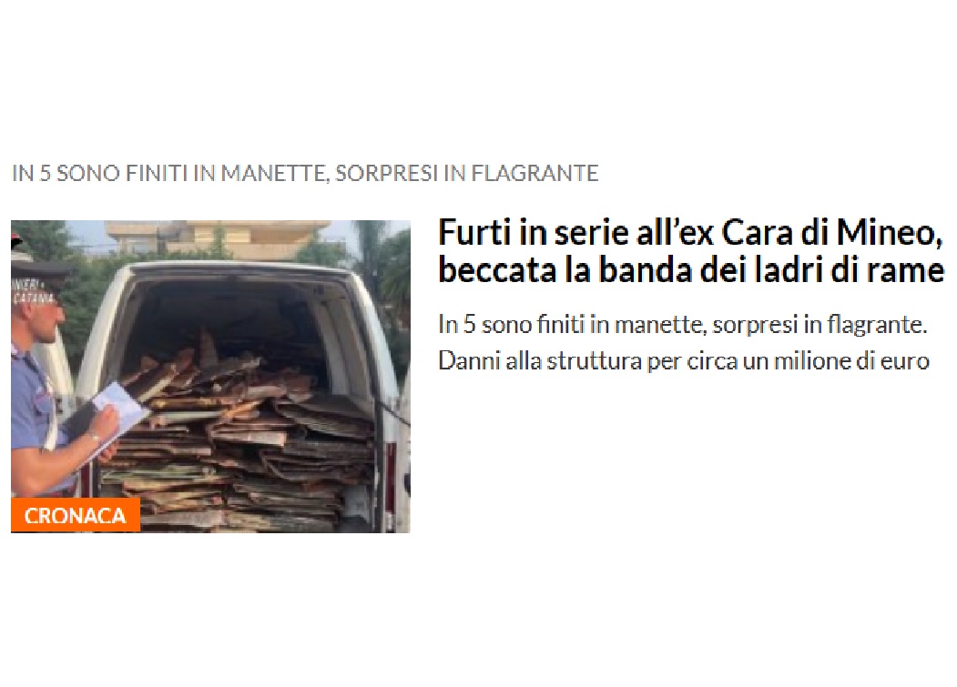 I carabinieri della stazione di Mineo supportati dai colleghi di Scordia e dal nucleo operativo e radiomobile della compagnia di Palagonia, dopo alcuni appostamenti, sono riusciti ad arrestare in flagranza uomini di Paternò tra i 25 ed i 44 anni. Nel mirino dei malviventi la struttura abitativa “Residence degli aranci” di Mineo, un’enorme complesso residenziale costituito da 404 appartamenti, che si estende per circa 30 ettari. Immobile che inizialmente era destinato ad accogliere i militari americani della vicina base aerea di Sigonella. Venne però utilizzato fino al luglio del 2019 come Centro di accoglienza per richiedenti asilo finanziato dallo Stato, il cosiddetto Cara. L’enorme complesso residenziale era diventato da alcuni mesi oggetto di ruberie di strutture metalliche, soprattutto manufatti in rame. Questi furti avevano provocato alla società proprietaria danni ben superiori al milione di euro.