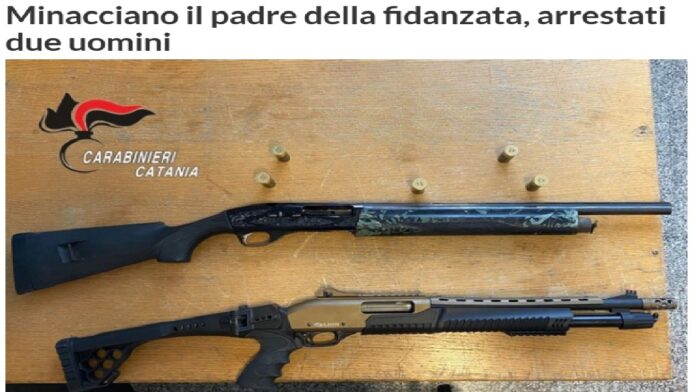 I carabinieri di Palagonia in Provincia di Catania…, hanno arrestato un uomo di 48 anni e il figlio di 24, entrambi braccianti agricoli, per detenzione di arma clandestina con relativo munizionamento e ricettazione in concorso. Il 24enne durante una lite avrebbe minacciato di morte il padre 39enne di una ragazza alla quale è legato da una relazione sentimentale e a dar manforte al giovane sarebbe intervenuto il padre 48enne.