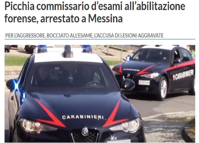 I carabinieri hanno arrestato a Messina con l’accusa di lesioni aggravate il 35enne di Milazzo che ieri sera ha aggredito e picchiato a sangue un avvocato, presidente di una sottocommissione per gli esami di abilitazione alla professione forense.