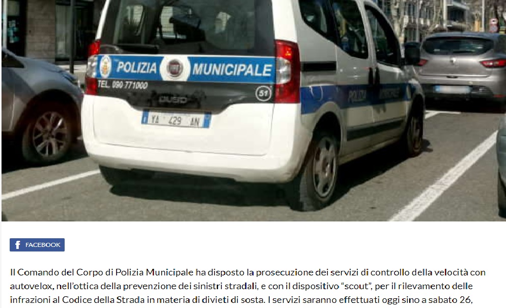 Il Comando del Corpo di Polizia Municipale ha disposto la prosecuzione dei servizi di controllo della velocità con autovelox, nell’ottica della prevenzione dei sinistri stradali, e con il dispositivo “scout”, per il rilevamento delle infrazioni al Codice della Strada in materia di divieti di sosta. I servizi saranno effettuati oggi sino a sabato 26, alternativamente sugli assi viari più interessati dal traffico.