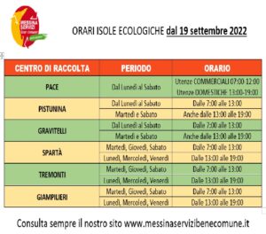 Messinaservizi Bene comune comunica che a partire dal prossimo lunedì 19 Settembre entreranno in vigore i nuovi orari al pubblico delle isole ecologiche cittadine. Pistunina e Gravitelli saranno aperte dal lunedì al sabato dalle 7:00 alle 13:00, e il martedì e il sabato saranno aperte anche dalle 13:00 alle 19.00. Le isole ecologiche di Spartà, Tremonti e Giampilieri resteranno aperte martedì, giovedì e sabato dalle 7 alle 13 e lunedì, mercoledì e venerdì dalle 13:00 alle 19:00.