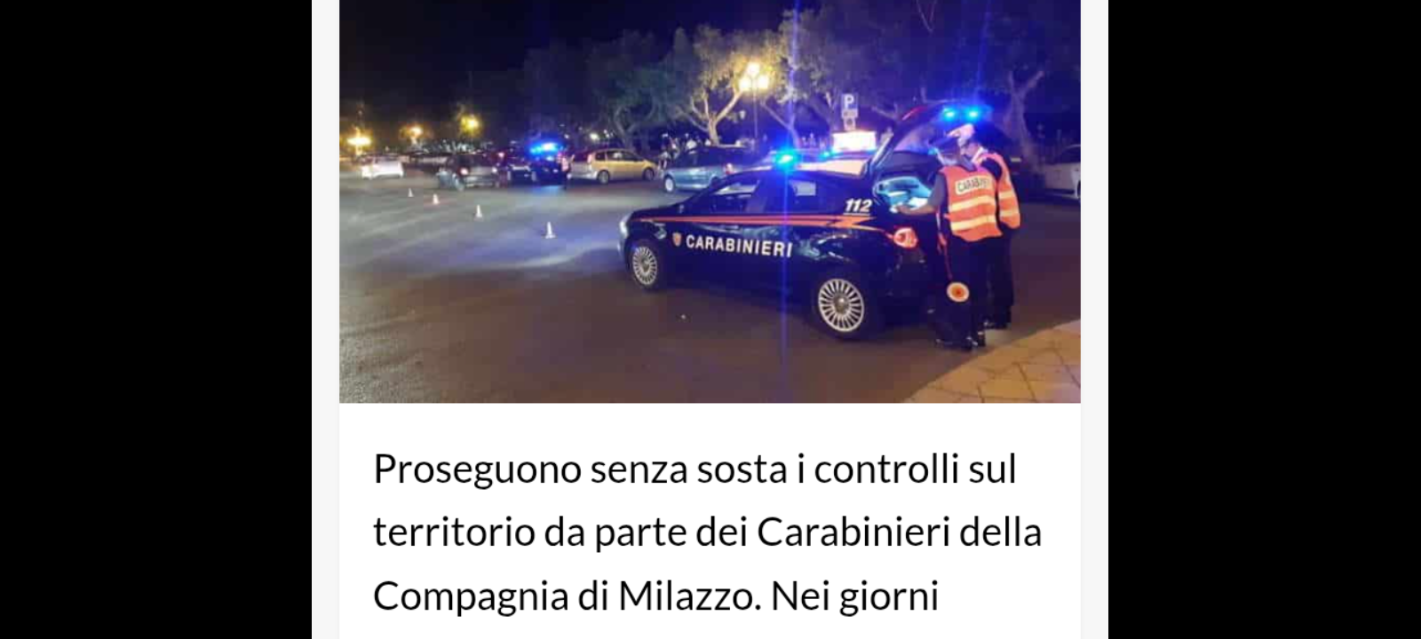 I controlli sul territorio da parte dei Carabinieri della Compagnia di Milazzo…, proseguono senza sosta: nei giorni scorsi è stato messo in campo un nuovo servizio straordinario di pattugliamento, attivo anche nelle ore notturne, con l’obiettivo di garantire la sicurezza dei cittadini, contrastare i reati predatori, lo spaccio di droga e le infrazioni al Codice della Strada, in particolare quelle legate alla guida sotto l’effetto di alcol e sostanze stupefacenti.