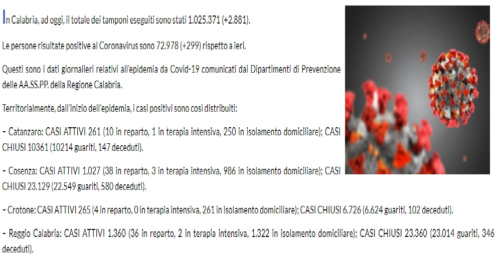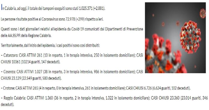 In Calabria, ad oggi, il totale dei tamponi eseguiti sono stati 1.025.371 (+2.881). Le persone risultate positive al Coronavirus sono 72.978 (+299) rispetto a ieri.