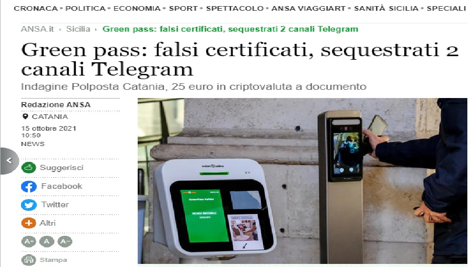 La Procura Distrettuale di Catania ha disposto il sequestro preventivo di due canali Telegram che proponevano la vendita di Green pass falsi. Il provvedimento è stato già convalidato dal Giudice per le indagini preliminari.