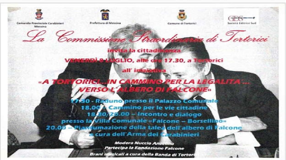 La Commissione Straordinaria di Tortorici, insediatasi a seguito dello scioglimento di quel comune il 23 dicembre 2020 per infiltrazione mafiosa, ha organizzato il prossimo 8 luglio (venerdì), in Tortorici (Me) alle ore 17.30 (con concentramento presso Palazzo Comunale), un evento della legalità dal titolo “A Tortorici in cammino per la legalità verso l’albero di Falcone”, sotto l’egida della Prefettura di Messina, con il supporto organizzativo dell’Arma dei Carabinieri ed il patrocinio della Società Editrice Sud, nel cui ambito, tra l’altro, sarà commemorata la morte di Giovanni Falcone e rinnovato il significativo evento della piantumazione dell’Albero di Falcone.