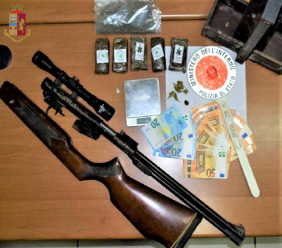 I poliziotti, nel corso di servizi finalizzati alla prevenzione e repressione del traffico e spaccio di sostanze stupefacenti, giovedì scorso, hanno eseguito una perquisizione nel domicilio dell’uomo. Nel corso della stessa hanno sequestrato 475 grammi di hashish, 43 grammi di marijuana, 0,40 grammi di cocaina, una carabina ad aria compressa, la somma in contanti di 960 euro, probabile provento dell’attività di spaccio, un bilancino di precisione e dei sacchetti in plastica per il confezionamento sottovuoto, utilizzati per confezionare le dosi, materiale occultato in varie parti e pertinenze dell’edificio.