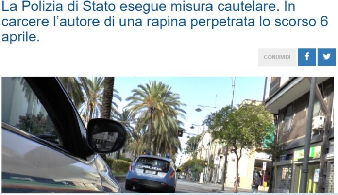 Ricevutolo – per una somma complessiva di circa 60 euro – si è dileguato. Le indagini esperite dalla Squadra Mobile della Questura di Messina e coordinate dall’Autorità Giudiziaria, hanno permesso di ricostruire rapidamente la vicenda e di dare un’identità al malvivente. Risolutiva la visione delle immagini dei sistemi di video sorveglianza presenti nell’area dove si è consumata la rapina. I poliziotti della Squadra Mobile hanno proceduto ieri all’esecuzione della misura cautelare con il trasferimento del venticinquenne in carcere.
