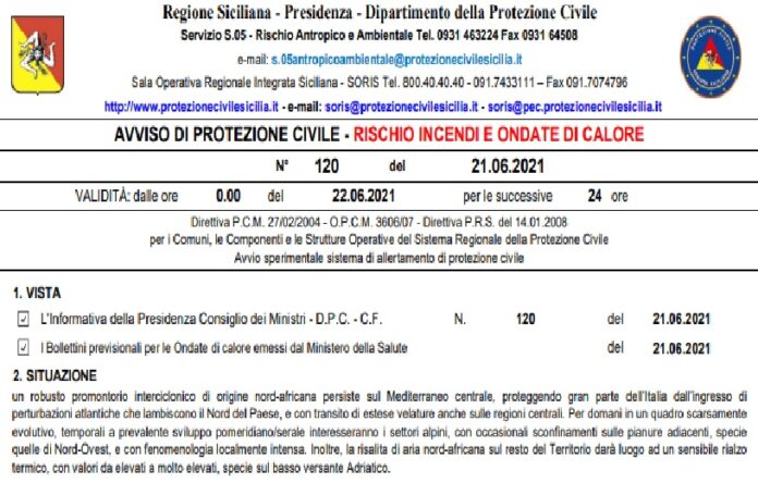 I responsabili del Dipartimento della Protezione Civile sedente presso la Regione Siciliana hanno diramato una allerta arancione [per rischio incendi e ondate di calore, con livello (2) di preallerta esteso a tutte le nove province in riferimento a possibili roghi e addirittura di livello (tre) rosso, per quel che concerne le ondate di calore nelle città di Catania e Palermo], che domani registreranno una temperatura percepita tra i 36 ed i 38 gradi.