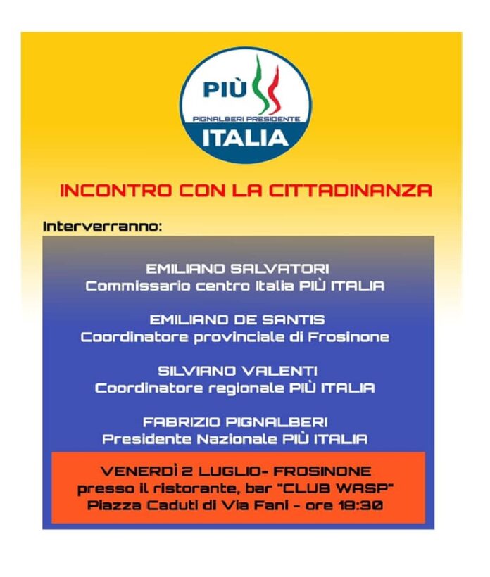 Più Italia…, riparte più forte di prima…, infatti i responsabili del Partito che ha come leader nazionale Fabrizio Pignalberi, si sono prodigati per organizzare alle odierne 18.30 un convegno a Frosinone al ristorante, bar “Club WASP”.