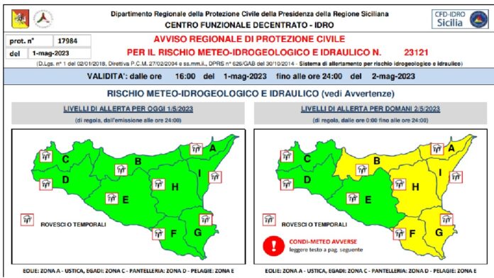 La Protezione Civile ha appena rilasciato il bollettino di allerta meteo per rischio idrogeologico valido per domani, martedì 02 maggio 2023, dalle ore 00:00 alle ore 24:00.