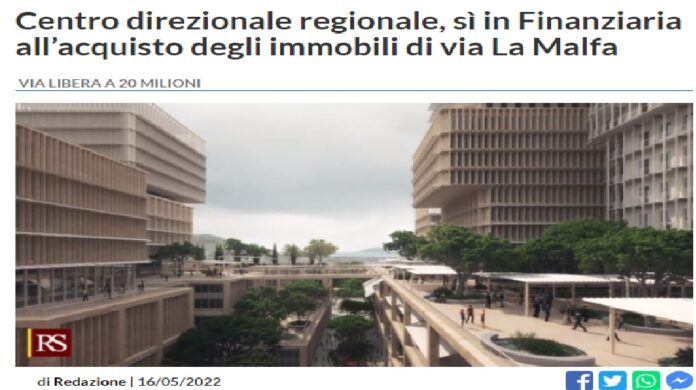 L’Assessorato regionale all’Economia è autorizzato all’acquisto del compendio immobiliare sito a Palermo in via La Malfa 169. E’ autorizzata alla spesa di 20 milioni”. E’ stata così approvata con la Finanziaria regionale la norma che riforma la normativa di finanza e contabilità regionale, che risaliva al 1977 nonché quella che consente di definire la realizzazione del Centro direzionale della Regione a Palermo.