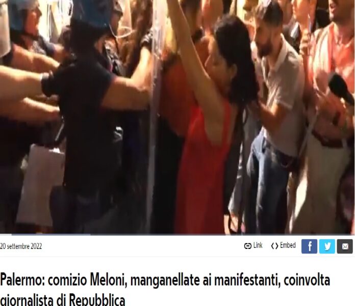 L’Associazione stampa parlamentare siciliana si schiera a fianco dei colleghi giornalisti che ieri pomeriggio sono stati coinvolti in alcuni episodi per le strade di Palermo durante gli interventi della polizia mentre in piazza Politeama era in corso il comizio della leader di Fratelli d’Italia Giorgia Meloni.
