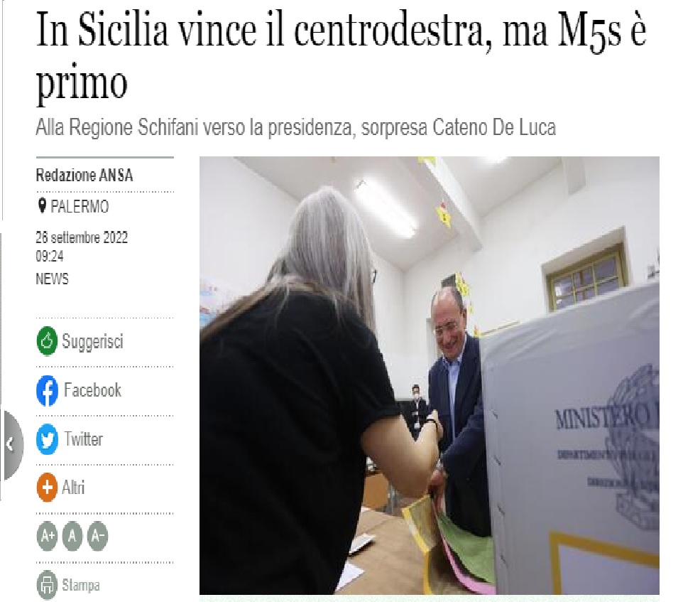 I risultati del voto in Sicilia, dove oltre che per le Politiche si votava anche per l’elezione del Presidente della Regione e dei parlamentari all’Assemblea regionale, confermano sostanzialmente anche nell’isola la vittoria del centrodestra, sia pure con qualche variabile soprattutto per quanto riguarda le Politiche dove si registra un exploit del M5s.