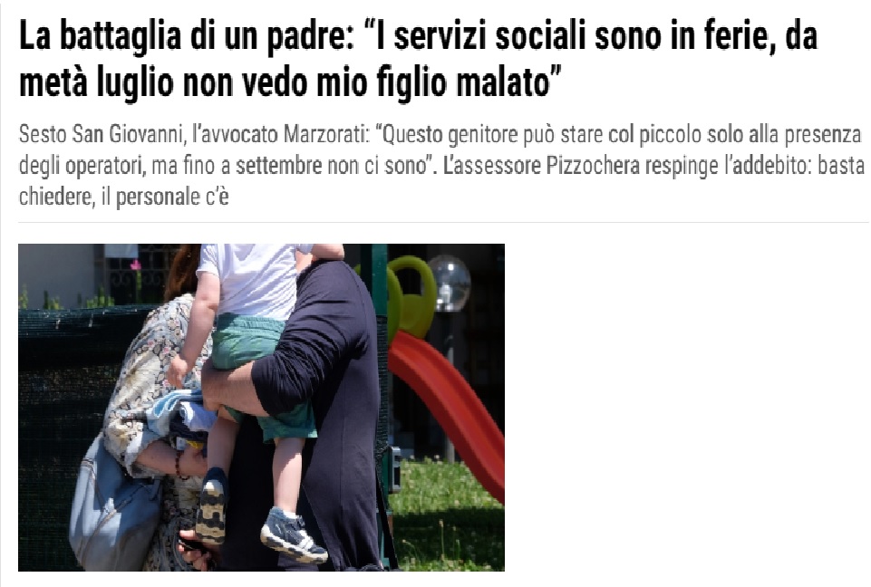 “I Servizi sociali sono in ferie fino a settembre e un bambino di 5 anni non può vedere suo padre per settimane: È un caso emblematico che non deve succedere più a nessuno… il Comune si organizzi”. A raccontare la vicenda è l’avvocato che lo assiste, Andrea Marzorati. L’amministrazione replica: “Il personale c’è, bastava mettersi d’accordo”.