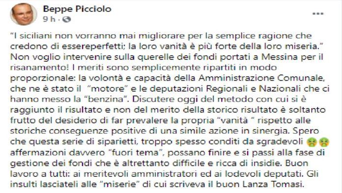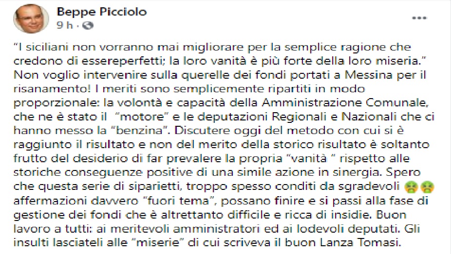 Picciolo aggiunge: “non voglio intervenire sulla querelle dei fondi portati a Messina per il risanamento! I meriti sono semplicemente ripartiti in modo proporzionale: la volontà e capacità dell’Amministrazione Comunale, che ne è stato il “motore”, e le deputazioni Regionali e Nazionali che ci hanno messo la “benzina”. Discutere oggi del metodo con cui si è raggiunto il risultato e non del merito della storico risultato è soltanto frutto del desiderio di far prevalere la propria “vanità“ rispetto alle storiche conseguenze positive di una simile azione in sinergia. Spero che questa serie di siparietti, troppo spesso conditi da sgradevoli affermazioni davvero “fuori tema”, possano finire e si passi alla fase di gestione dei fondi che è altrettanto difficile e ricca di insidie.