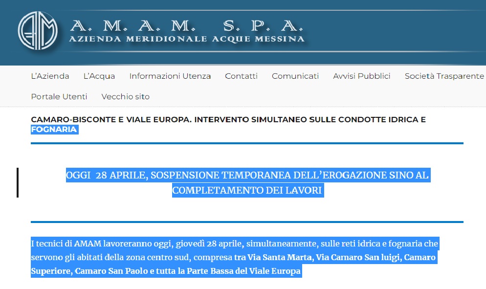 I tecnici di AMAM lavoreranno oggi, giovedì 28 aprile, simultaneamente, sulle reti idrica e fognaria che servono gli abitati della zona centro sud, compresa tra Via Santa Marta, Via Camaro San luigi, Camaro Superiore, Camaro San Paolo e tutta la Parte Bassa del Viale Europa.