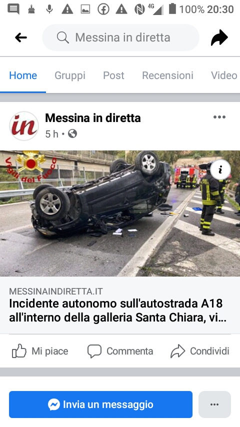 I Vigili del fuoco del Comando di Messina sono intervenuti intorno alle 11.45 per un incidente autonomo in autostrada all’interno della galleria Santa Chiara a Roccalumera (ME). La vettura transitava in direzione Ct-Me. Non si conoscono le cause del ribaltamento.