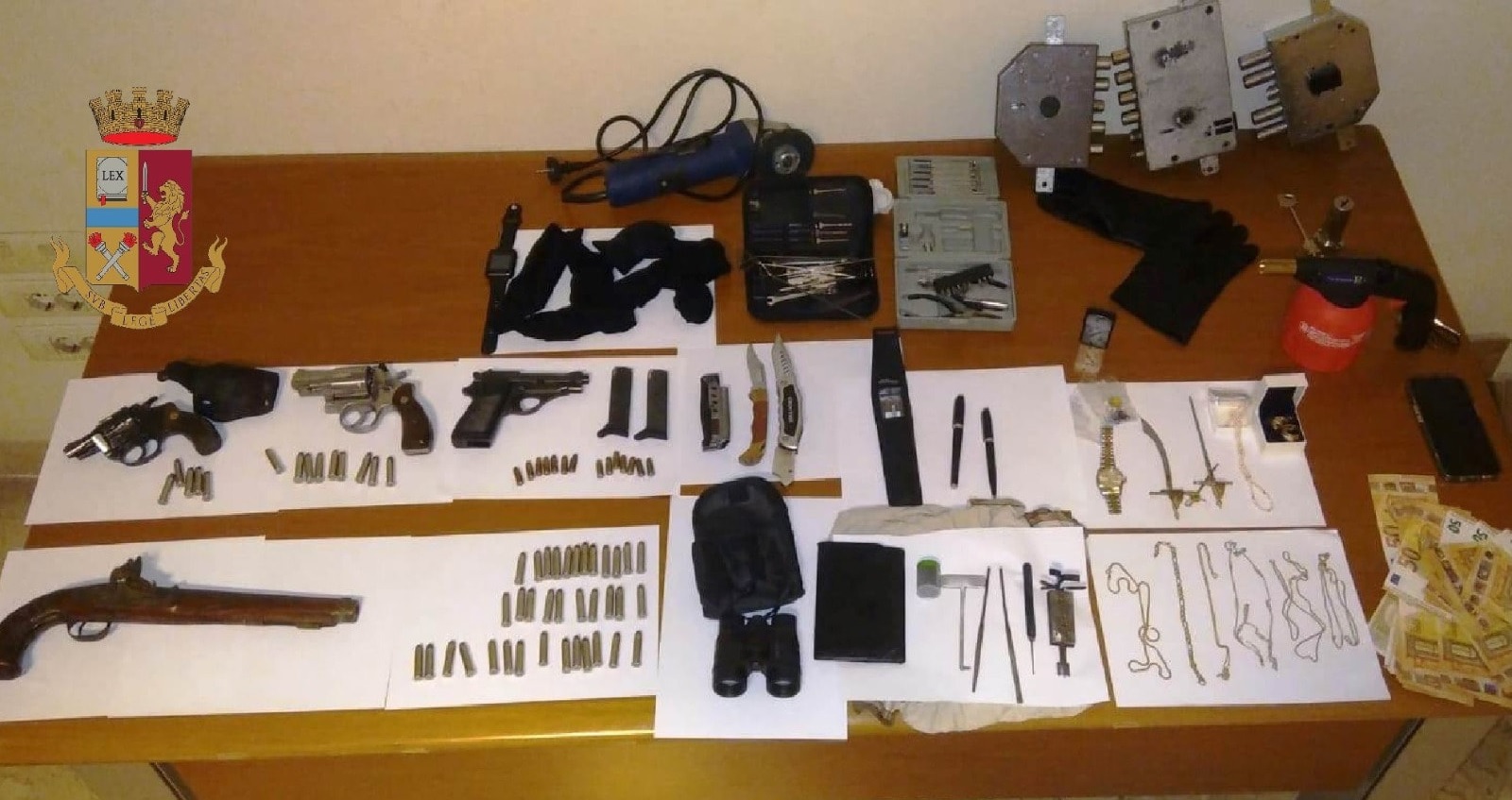 I #poliziotti della Questura di Napoli durante la perquisizione hanno rinvenuto, nella camera da letto: 3 pistole risultate provento di furto, un fucile d’epoca privo di matricola, 7 cartucce cal.7,65, 3 coltelli a serramanico, una chiave “bulgara” con relativi chiavistelli, tre serrature e un nottolino con chiave, un binocolo, un flex, una fiamma ossidrica da campeggio priva di bombola, due paia di guanti, due orologi di noti marchi, numerosi monili, bracciali e anelli d’oro dei quali non hanno saputo giustificare la provenienza, e 1350 euro.