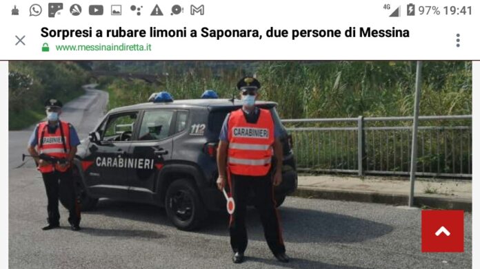 È stata una richiesta pervenuta al numero unico di pronto intervento 112 NUE a segnalare la presenza di due individui che, giunti in contrada Vini di Saponara, dopo aver scavalcato la recinsione, si erano introdotti in un fondo agricolo per asportare dei limoni dagli alberi.