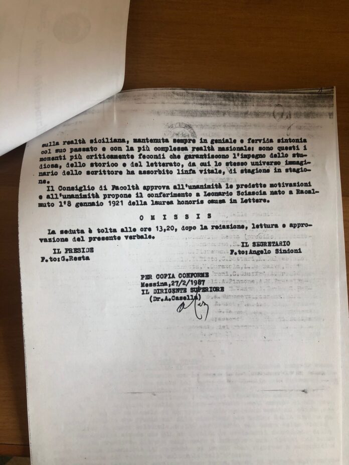 Il 14 febbraio 1987 il consiglio della Facoltà di Lettere dell’ateneo messinese approvò all’unanimità la laurea honoris causa a Leonardo Sciascia, il 14 giugno dello stesso anno seguì l’approvazione del Ministero ma il riconoscimento, senza motivo, non fu mai conferito: un mistero dell’Università di Messina venuto a galla ieri in occasione dell’incontro promosso dall’Ordine degli avvocati per presentare il volume “Diritto verità giustizia. Omaggio a Leonardo Sciascia”, scritto da illustri giuristi italiani e curato dai consiglieri della Corte di Cassazione Luigi Cavallaro e Roberto Conti con l’obiettivo di approfondire il rapporto tra il grande scrittore siciliano e la giustizia. A raccontare le ambigue vicende di questo giallo made in Messina, l’ex rettore e presidente emerito della Corte Costituzionale Gaetano Silvestri, il quale, oltre un decennio dopo i fatti registrati in vari documenti, nel giugno 2000, decise di assegnare la prestigiosa laurea ad honorem alla memoria, dato che Sciascia era già venuto a mancare nell’89 e tra l’altro sognava da tempo una laurea, anche se avrebbe preferito quella in legge.