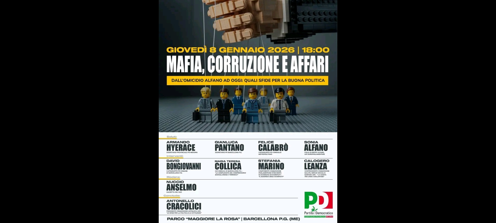 All’evento parteciperanno “in un dibattito che vuole parlare al territorio e alle nuove generazioni, rilanciando una visione di buona politica fondata su responsabilità, coerenza e coraggio”: ‘Antonello Cracolici (presidente della Commissione parlamentare antimafia all’Assemblea regionale siciliana di Palermo); Gianluca Pantano (segretario cittadino del PD di Barcellona Pozzo di Gotto); David Bongiovanni (capogruppo del PD al Consiglio Comunale di Barcellona Pozzo di Gotto); Mariateresa Collica (già sindaca di Barcellona Pozzo di Gotto); Felice Calabrò (capogruppo del PD presso il Consiglio Metropolitano della Città Metropolitana di Messina); Armando Hyerace (segretario provinciale del PD di Messina); Stefania Marino (componente della Commissione parlamentare d’Inchiesta su Ecomafie ed Ecorifiuti); Calogero Leanza (vicepresidente della Commissione parlamentare Salute e Servizi Sociali dell’Assemblea regionale siciliana a Palermo); Sonia Alfano (figlia di Beppe Alfano, già deputata europea); Nuccio Anselmo (giornalista di cronaca giudiziaria della Gazzetta del Sud)’.