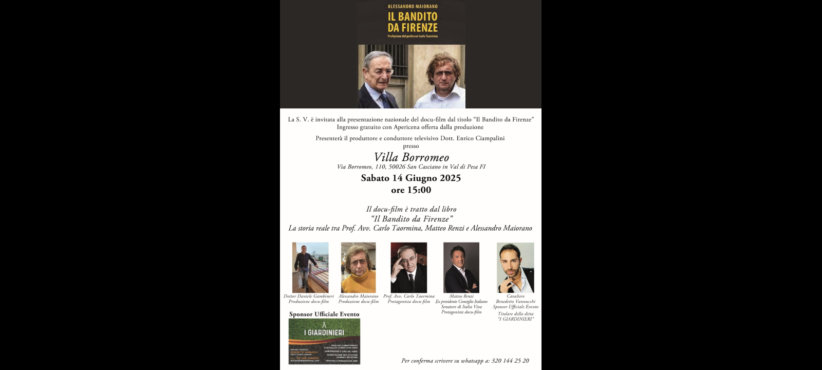 Il bandito da Firenze il docu-film…, si svolgerà il 14 giugno 2025 alle ore 15 presso la villa Borromeo a San Casciano in val di pesa (Firenze): è prevista la presentazione nazionale del docu-film dal titolo Alessandro Maiorano il bandito da Firenze… tratto direttamente dall’omonimo libro scritto e prodotto dallo stesso ex dipendente di palazzo vecchio salito agli onori della cronaca nazionale per essere stato per ben 12 anni il nemico storico dell’ex presidente del consiglio italiano Matteo Renzi.