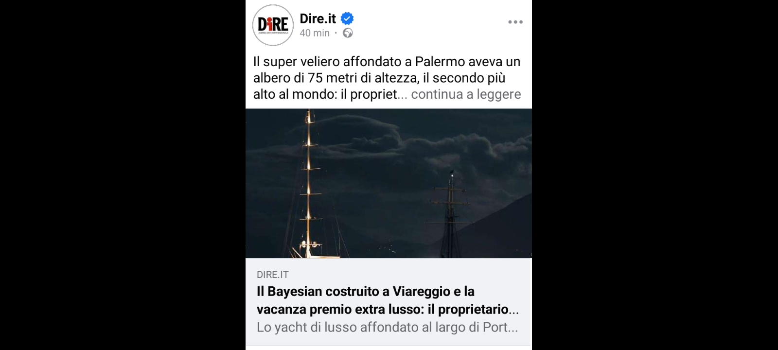 Di fianco allo yacht c’era anche un’altra barca a vela, più piccola, la Sir Robert B P, battente bandiera olandese, che non ha però riportato danni con la tromba d’aria: le persone a bordo sono state le prime ad aiutare i sopravvissuti al naufragio del Bayesian. I due velieri sono stati immortalati insieme, uno a fianco all’altro, nell’immagine che è stata scattata intorno alle 22 dal gestore del ristorante Baia di Santa Nicolicchia di Porticello: l’uomo, Fabio La Bianca, aveva condiviso già il giorno prima una foto del veliero olandese, quello più piccolo. Ieri sera, a poche ore dalla tragedia, ha postato la foto del grande yacht di lusso per mostrarne la bellezza.