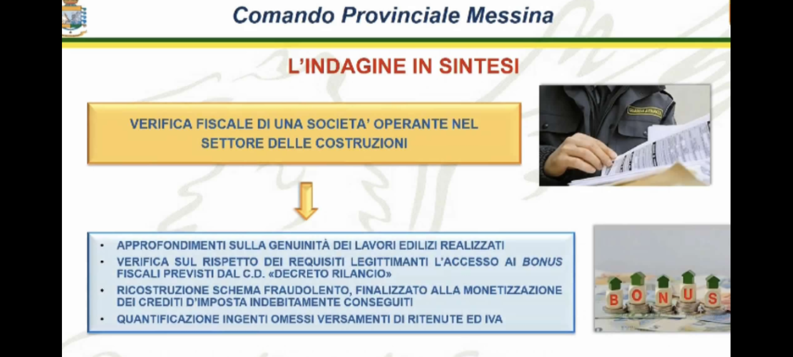 Le investigazioni, condotte nel settore dell’indebita percezione di bonus edilizi, coordinate dalla Procura della Repubblica presso il Tribunale di Barcellona Pozzo di Gotto, sono scaturite dalle risultanze di una verifica fiscale condotta dal Nucleo di Polizia Economico-Finanziaria di Messina, che ha portato alla scoperta di un meccanismo fraudolento, appositamente ideato per beneficiare indebitamente delle agevolazioni introdotte dal decreto Legge 34 del 2020 – cosiddetto decreto “Rilancio”.