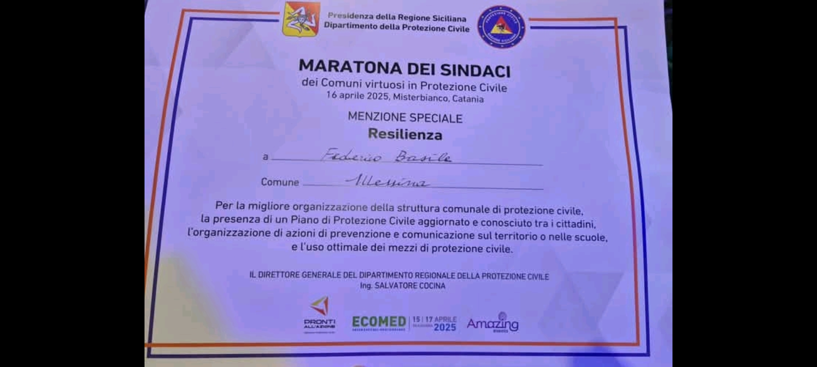 Il Comune di Messina è stato insignito della menzione speciale “Resilienza” nell’ambito della Maratona dei Sindaci dei Comuni virtuosi in Protezione Civile, svoltasi ieri, mercoledì 16 aprile, presso SiciliaFiera, a Misterbianco (CT), durante il salone ECOMED – Green Expo del Mediterraneo.