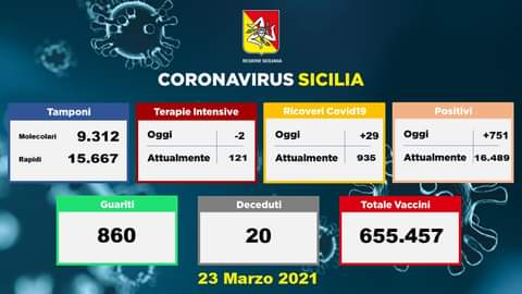 Il dato dei ricoveri oggi per #Coronavirus negli ospedali siciliani rispetto a ieri vede un incremento complessivo di 29 unità, così come riporta il bollettino quotidiano del Ministero della Salute. In terapia intensiva sono in cura 121 persone (2 in meno rispetto a ieri). Il dato dei guariti è pari a 860 persone. 20 i decessi. I nuovi soggetti positivi rilevati sono 751. I tamponi molecolari processati sono stati 9312. I tamponi rapidi sono stati 15667. Le dosi di vaccino complessivamente inoculate sono 655457.