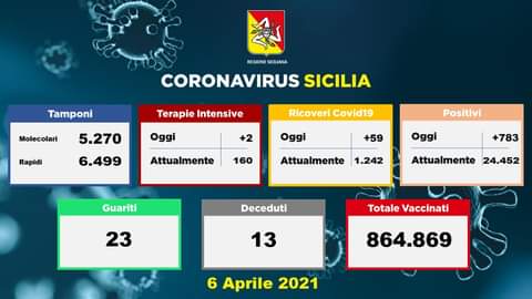 Il dato dei ricoveri oggi per #Coronavirus negli ospedali siciliani rispetto a ieri vede un incremento complessivo di 59 unità, così come riporta il bollettino quotidiano del Ministero della Salute. In terapia intensiva sono in cura 160 persone (2 in più rispetto a ieri). Il dato dei guariti è pari a 23 persone. 13 i decessi. I nuovi soggetti positivi rilevati sono 783. I tamponi molecolari processati sono stati 5270. I tamponi rapidi sono stati 6499. Le dosi di vaccino complessivamente inoculate sono 864869.