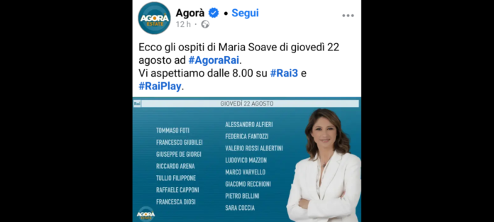 ‘Il dibattito sullo ius scholae, le priorità della manovra economica, le polemiche sull’immigrazione; gli ultimi aggiornamenti sul Bayesian, sui dispersi e sulle possibili cause del naufragio’. Sono questi i principali temi della puntata di “Agorà Estate”, che è iniziata in onda giovedì 22 agosto alle 8.00 su Rai 3. Come ogni giovedì torna la rubrica “Giro d’Italia” di Paolo Notari, stavolta in collegamento da Norcia.