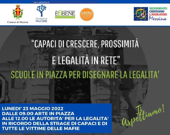 Il Movimento Cristiano Lavoratori di Messina, con la Fondazione Èbbene, lunedì 23 maggio, a Piazza Casa Pia, organizza una giornata nazionale per la legalità con gli studenti- ‘’Capaci di Crescere, Legalità e Prossimità in Rete”. Un’iniziativa patrocinata dalla Fondazione Falcone.