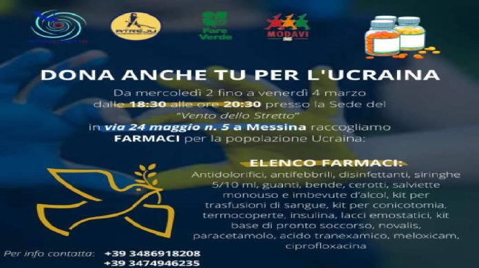 Il Movimento “Vento dello Stretto” informa tutta la cittadinanza che da mercoledì 2 marzo fino a venerdì 4 marzo dalle 18:30 alle 20:30 presso la sede di Via XXIV Maggio n. 5 verranno raccolti farmaci per la popolazione Ucraina che saranno spediti nelle zone di guerra tramite la collaborazione con l’Associazione “Modavi Onlus” e con la “Croce Rossa Italiana”.